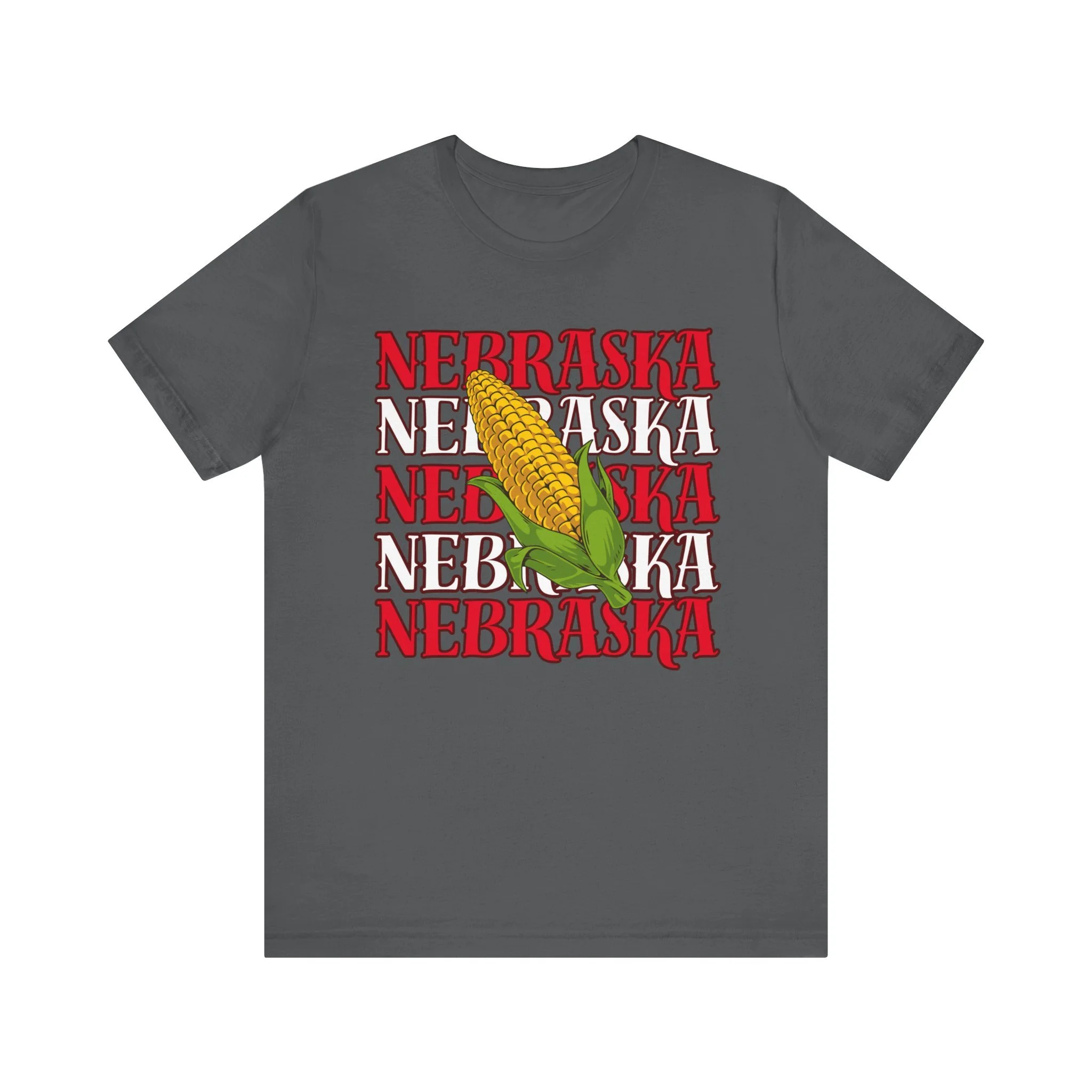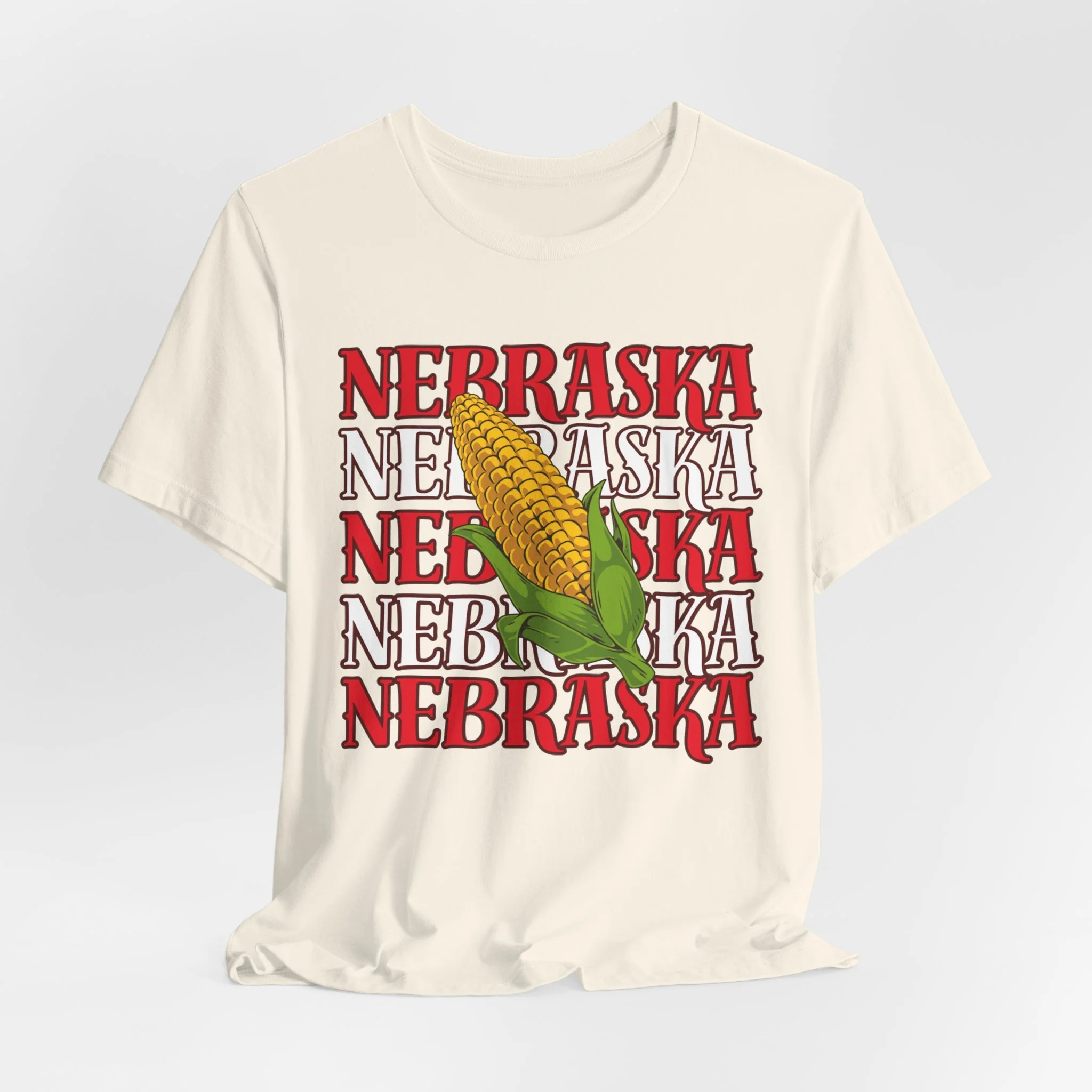 Celebrate your Nebraska pride in style with this bold, one-of-a-kind design! Featuring the word Nebraska repeated three times in a modern stacked layout, topped with a playful corn cob overlay, this shirt is the perfect mix of hometown charm and standout style.